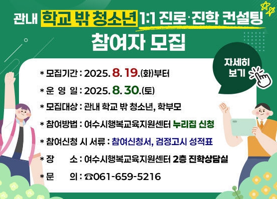 ▲ 여수시행복교육지원센터 ‘관내 학교 밖 청소년 1:1 진로‧진학 컨설팅‘ 포스터
