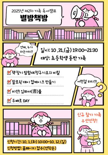 [무한뉴스=정민정 기자] 삼척교육문화관은 10월 31일 가족과 함께 도서관에서 특별하고 즐거운 추억을 만들 수 있는 ‘2025년 제2차 독서캠프 ‘별밤책밤’을 운영한다.