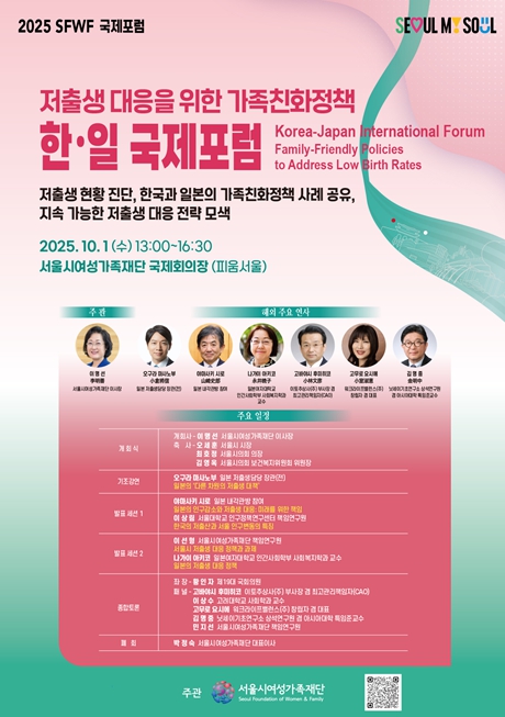 [무한뉴스=정승훈 기자] 서울시여성가족재단은 오는 10월 1일 오후 1시부터 4시 30분까지 서울여성플라자 국제회의장에서 '저출생 대응을 위한 가족친화정책 한·일 국제포럼'을 개최한다고 밝혔다.