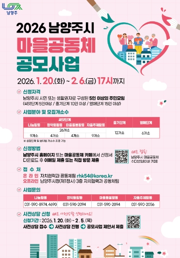 [무한뉴스=정승훈 기자] 남양주시는 1월 20일부터 2월 6일까지 ‘2026년 마을공동체 공모사업’참여 공동체를 공개 모집한다.