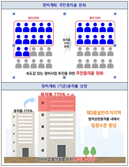 먼저, 정비계획 수립을 위한 주민 동의율을 기존 60%에서 50%로 완화해 속도감 있는 사업 추진을 유도한다.
