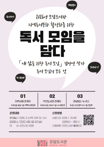 [무한뉴스=정승훈 기자] 김포시 모담도서관은 독서 모임을 주제로 2월 5일 목요일 오후 3시부터 5시까지 저자 강연을 운영한다.