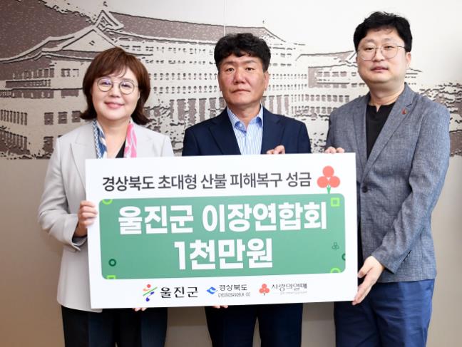 기탁식에는 장동윤 울진군이장연합회장과 양금희 경상북도 경제부지사 등이 참석했으며, 기탁된 성금은 경북사회복지공동모금회를 통해 피해 지역의 복구와 이재민 지원사업 등에 사용될 예정이다.
