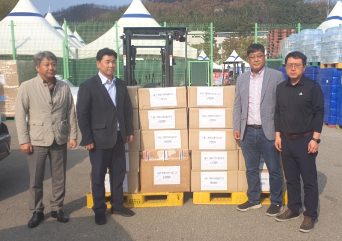 ▲ 치과의료기기산업협회 윤범철 부회장이 산불 이재민들을 돕기 위해 창수면에 성품을 전달하고 있다. |