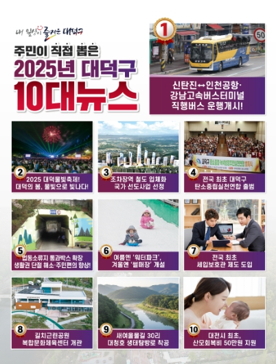 최충규 대덕구청장은 “올해 10대 뉴스는 주민들이 실생활에서 체감할 수 있는 교통·복지·문화 사업이 상위권을 차지한 것이 특징”이라며 “앞으로도 주민 삶의 질 향상을 최우선 가치로 두고, 대덕의 가치를 두 배로 높여 웅비하는 대덕을 만들겠다”고 말했다.