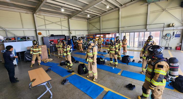 교육 내용은 ▲특수방화복 및 공기호흡기 착용 숙달 ▲복식사다리 운반 및 설치 ▲옥내소화전 활용 화재진압 등 체계적으로 구성됐다.