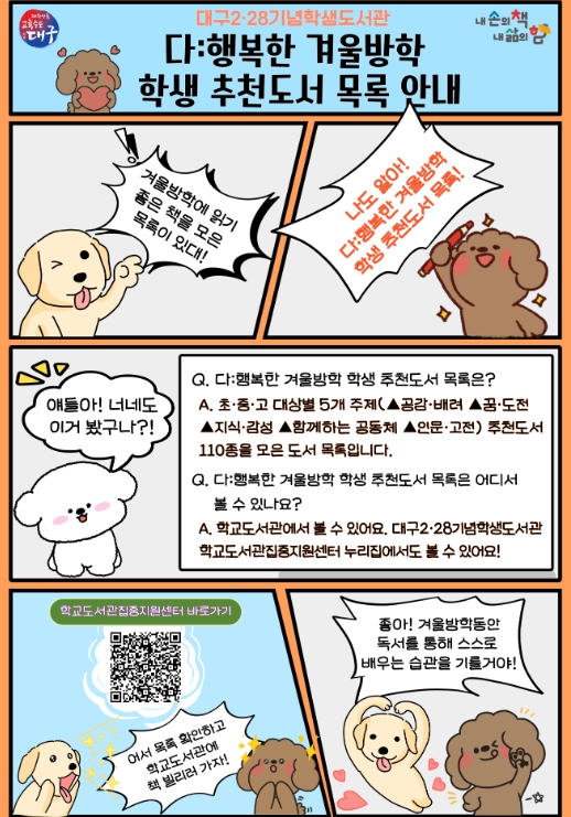 [무한뉴스=최진수 기자] 대구2·28기념학생도서관은 겨울방학을 맞아 학생들이 독서를 통해 정서적 성장과 사고력 신장을 도모할 수 있도록 학생 맞춤형 추천도서 목록인 ‘다:행복한 겨울방학 학생 추천도서 목록’을 배포한다.