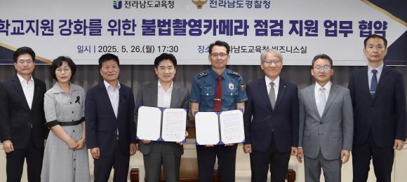 [무한뉴스=정민정 기자] 전라남도교육청과 전라남도경찰청은 26일 전라남도교육청에서 ‘불법 촬영 카메라 점검 및 학교 지원 체계 구축’을 위한 업무협약을 체결했다.