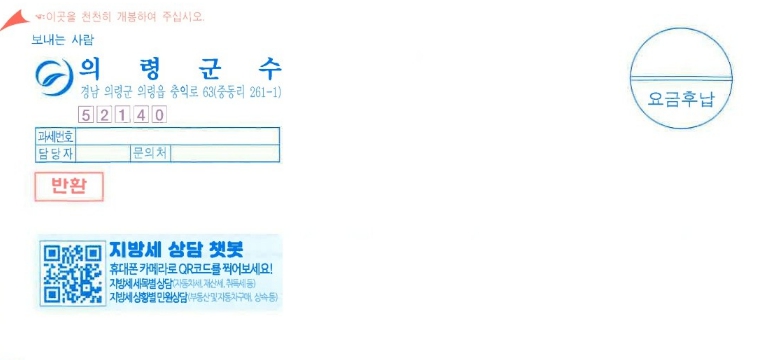 [무한뉴스=최진수 기자] 의령군은 지방세 고지서 전면에 ‘지방세 챗봇 상담서비스’ QR코드를 삽입해 발송한다고 밝혔다.