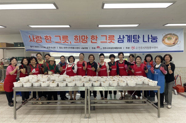 온은아 전주시여성단체협의회 회장은 “작은 정성이지만 무더위 속에서 힘겹게 생활하는 분들에게 조금이나마 힘이 되고자 삼계탕을 준비했다”면서 “앞으로도 소외된 이웃을 위한 지속적인 나눔 활동을 이어나가는 단체가 되도록 노력하겠다”고 말했다.