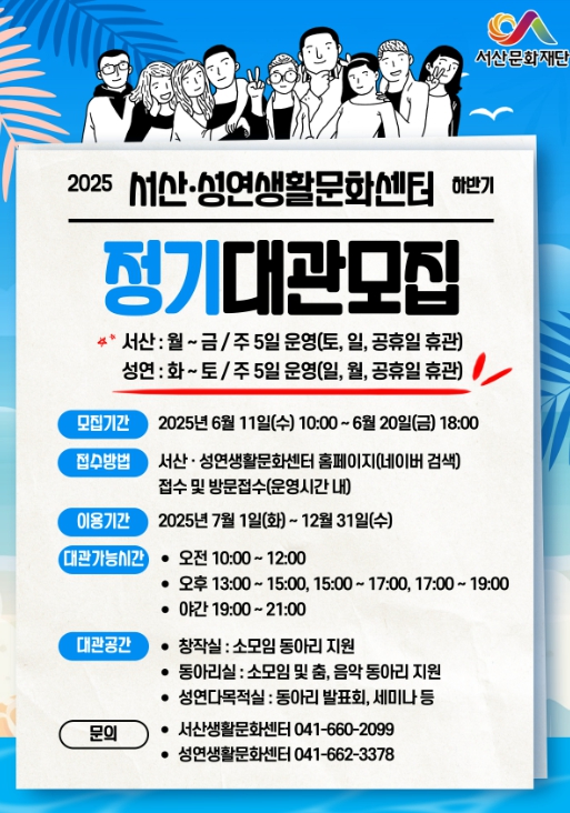 | ▲ 서산·성연생활문화센터, 2025년 하반기 정기대관 신청 접수 |