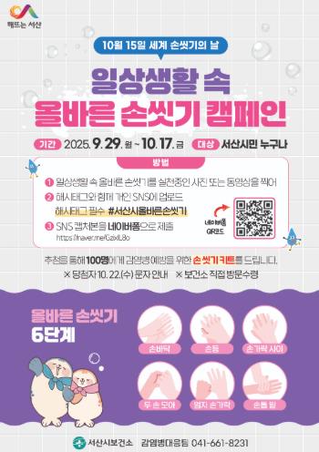 [무한뉴스=정민정 기자] 충남 서산시는 세계 손씻기의 날(10월 15일)을 맞아 10월 17일까지 다양한 행사를 진행한다고 밝혔다.