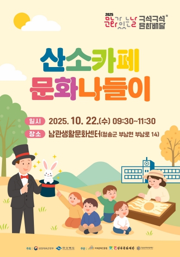 [무한뉴스=최진수 기자] (재)청송문화관광재단은 오는 10월 22일과 11월 25일 청송군 부남면 남관생활문화센터에서 2025 문화가 있는 날 '구석구석 문화배달' 사업의 일환으로 ‘산소카페 문화나들이’ 행사를 개최한다.