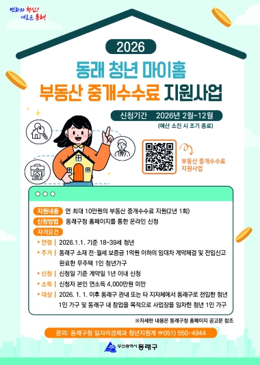 [무한뉴스=최진수 기자] 부산 동래구는 청년의 주거 안정을 지원하고 청년 창업을 유도하기 위해 ‘2026년 동래 청년 마이홈 부동산 중개수수료 지원 사업’을 추진한다고 밝혔다. 접수 기간은 12월 10일까지이며, 예산 소진 시 조기 마감된다.