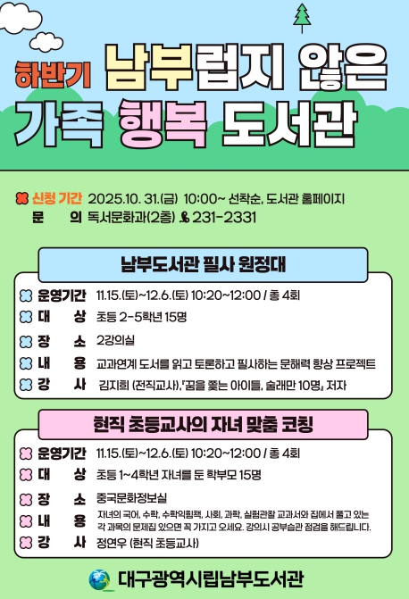 [무한뉴스=최진수 기자] 대구남부도서관은 11월 15일부터 12월 6일까지 매주 토요일, 부모와 자녀가 함께 도서관을 찾아 각자 맞춤형 독서·학습 프로그램에 참여하는 ‘남부럽지 않은 가족 행복 도서관’을 운영한다.