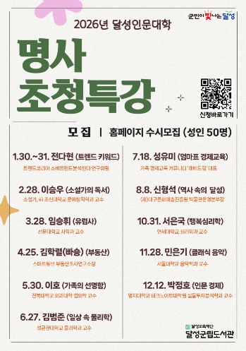 강연별로 선착순 50명을 모집하며, 참가비는 무료다. 신청은 강연일 기준 2주 전 화요일 오전 9시부터 달성군립도서관 누리집을 통해 가능하다.