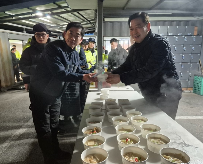 [무한뉴스=최진수 기자] 대구 남구의 조재구 남구청장이 병오년 새해 첫날 새벽, 앞산 큰골에 위치한 환경공무직 근무 현장을 찾아 이른 새벽부터 근무에 나선 환경공무직 직원들을 직접 만나 새해 덕담을 전하고, 떡국 한 그릇을 함께 나누며 감사의 마음을 전했다.