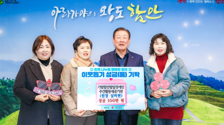 [무한뉴스=최진수 기자] 함안군은 지난 8일 가람함안발달장애인 주간활동제공기관이 ‘제6회 함안애(愛)복지박람회’에서 마련한 수익금 100만 원을 지역사회에 기부했다고 밝혔다.