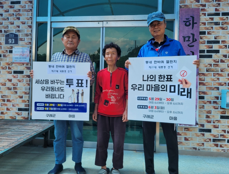 [무한뉴스=정민정 기자] 전남 구례군은 마을 이장들이 자발적으로 뜻을 모아 주민들의 선거 참여를 독려하는 ‘동네 한바퀴 챌린지’캠페인이 개최됐다고 밝혔다.