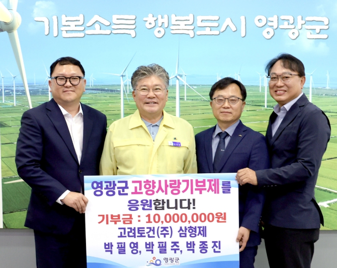 [무한뉴스=정민정 기자] 지난 11일, 고려토건(주) 박필영, 박필주, 박종진 삼형제가 고향사랑기부금 1천만 원을 기탁하여 영광 발전을 위한 따뜻한 나눔을 실천했다.