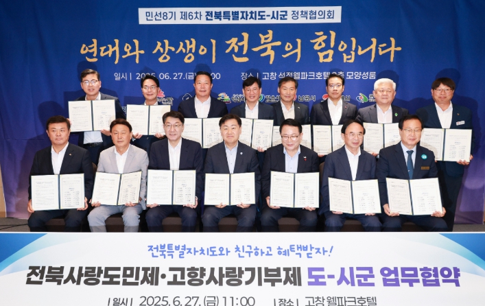 한편, 이날 회의에서는 ‘전북사랑도민제’와 ‘고향사랑기부제’ 활성화를 위한 업무협약도 체결됐다. 전북사랑도민제는 전북 외 지역 거주자를 대상으로 가입 유도와 할인가맹점 확대를 추진하고, 고향사랑기부제는 도와 시군 간 상호 홍보, 상호 기부, 공동사업 발굴을 통한 협력 기반을 강화한다는 내용이 포함됐다.