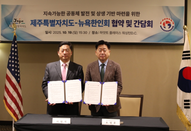 [무한뉴스=정민정 기자] 제주특별자치도가 미국 동부 50만 한인을 대표하는 뉴욕한인회와 손잡고 경제·관광·문화·교육 분야 글로벌 협력 네트워크를 본격 가동한다.