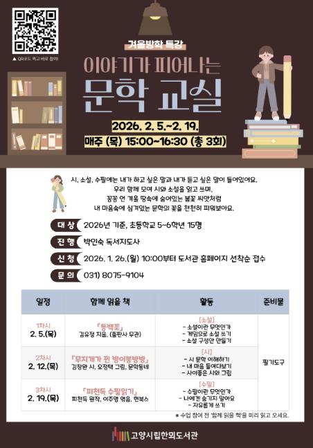 [무한뉴스=정승훈 기자] 고양특례시 한뫼도서관은 겨울방학을 맞아 초등학교 고학년을 대상으로 한 특강‘이야기가 피어나는 문학 교실’을 운영한다.