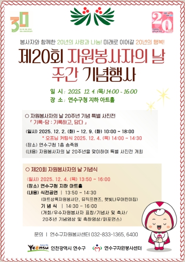 [무한뉴스=정승훈 기자] 인천광역시 연수구자원봉사센터에서는 오는 12월4일 자원봉사자의날 20주년 기념식을 연수구청 지하 아트홀에서 개최한다고 밝혔다. 이날 ‘20년의 나눔을 넘어 미래로 이어갈 20년의 행복’을 주제로 열릴 기념식 행사는 지난 20년간 지역사회 곳곳에서 묵묵히 헌신해온 자원봉사자들의 발자취를 돌아보고 앞으로의 20년을 향한 새로운 비전을 공유하기 위해 마련된다.
