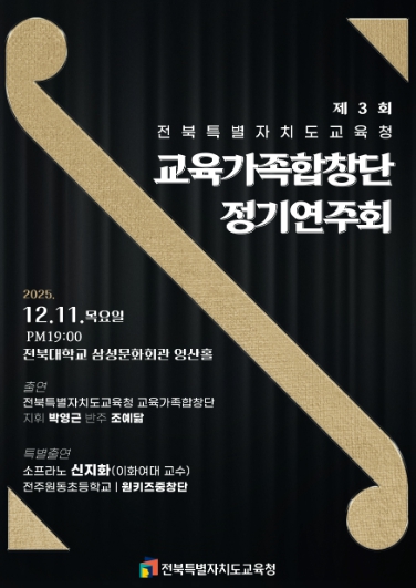 [무한뉴스=정승훈 기자] 전북특별자치도교육청은 오는 11일 오후 7시 전북대학교 삼성문화회관에서 ‘제3회 전북특별자치도교육청 교육가족합창단(이하 교육가족합창단) 정기연주회’를 개최한다고 밝혔다.