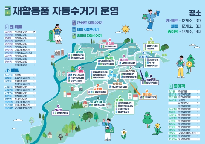 신규 설치된 자동수거기는▲쌍학어린이공원(2대) ▲풍암호수공원 ▲치평어린이공원 ▲내방어린이공원 ▲콩콩어린이공원 ▲화추어린이공원 ▲유덕어린이공원 ▲상무1동‧화정4동‧금호2동 행정복지센터 ▲서구청 등 주민 접근성이 높은 생활권 중심에 배치돼 이용 편의성을 높였다.