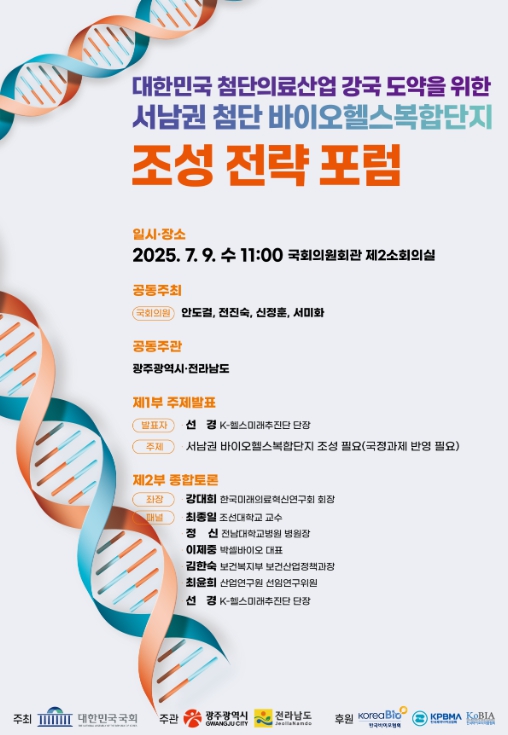 선경 K-헬스미래추진단장이 ‘서남권 바이오헬스복합단지 필요성과 전략’을 주제로 발표하고, 이어지는 토론회는 강대희 한국미래의료혁신연구회장이 좌장을 맡아 진행된다.