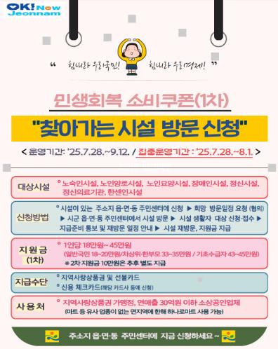 [무한뉴스=정민정 기자] 전라남도는 노인·장애인 등 취약계층의 민생회복 소비쿠폰 지급 사각지대 해소를 위해 오는 28일부터 8월 1일까지 지역 생활시설을 대상으로 ‘찾아가는 시설 방문 신청’을 집중 운영한다고 밝혔다.