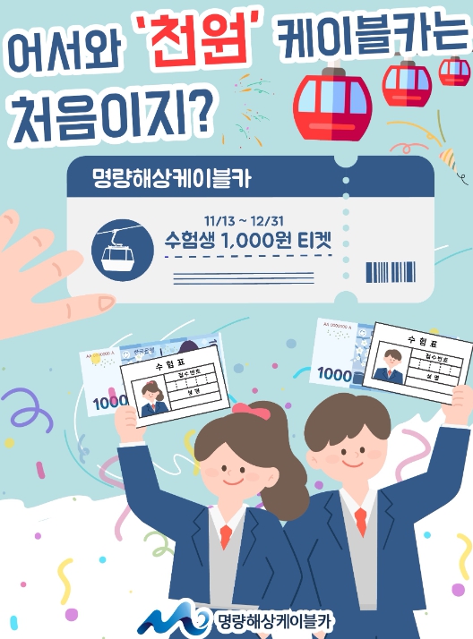 명량해상케이블카에서는 2026학년도 대학수학능력시험을 마친 수험생들을 대상으로 오는 11월 13일부터 연말까지 수험생들에게 ‘천원 케이블카’ 이벤트를 진행한다고 밝혔다.