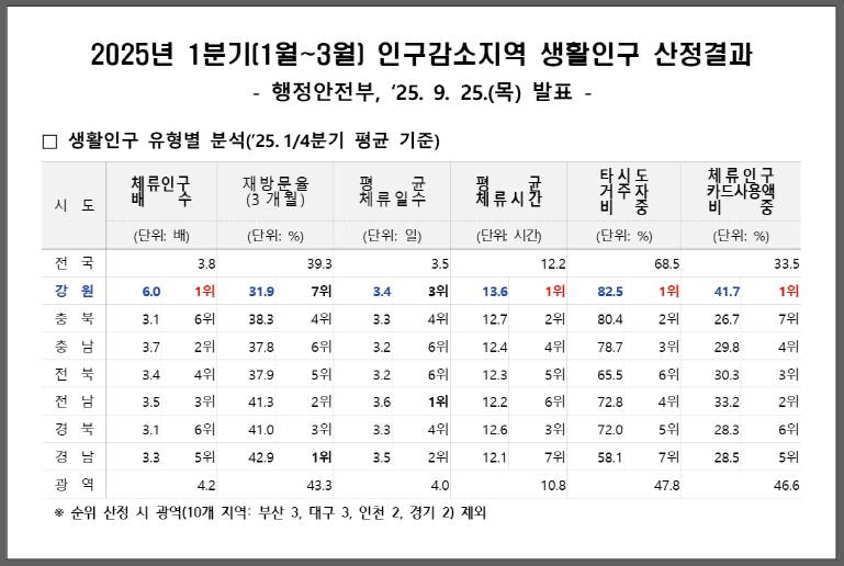 [무한뉴스=정민정 기자] 강원특별자치도는 행정안전부가 9월 25일 발표한 ‘2025년 1분기 인구감소지역 생활인구 산정 결과’에서 체류인구 총 2,826,012명으로 전국 최고 수준을 기록했다고 밝혔다.