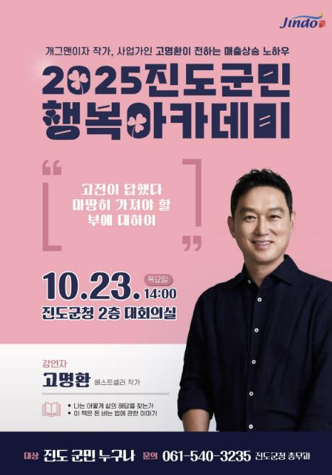 [무한뉴스=정민정 기자] 진도군은 오는 10월 23일 오후 2시, 진도군청 대회의실에서 개그맨 출신의 고명환 작가를 초청해 ‘진도 군민행복 아카데미’ 강연을 개최한다고 밝혔다.