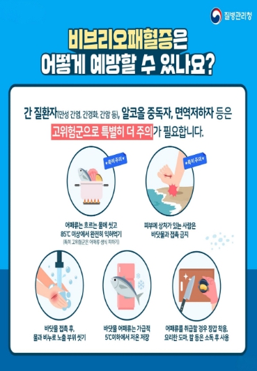 이에 따라 보건당국은 만성질환자 및 면역저하자 등 고위험군은 해산물 섭취 시 반드시 익혀 먹고, 바닷물과의 접촉을 피할 것을 권고하고 있다. 또한, 피부에 상처가 있는 경우 해변이나 갯벌 활동을 자제하고, 바닷물 접촉 후에는 깨끗한 물로 즉시 씻는 것이 중요하다.