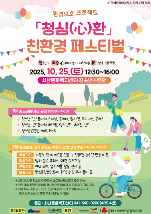 환경보호 프로젝트 ‘청심(心)환’은 ‘청소년의 마음(心)에서부터 시작되는 환경보호 프로젝트’라는 뜻으로, 서산문화복지센터가 주최·주관하고 한화토탈에너지스와 충남사회복지공동모금회가 후원하는 사업이다.