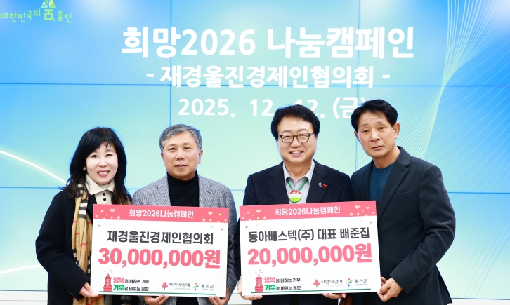 [무한뉴스=최진수 기자] 울진군은 지난 12월 12일 재경울진경제인협의회로부터‘희망2026 나눔캠페인’성금 3,000만 원을, 명예회장이자 울진 아너 3호 동아베스텍(주) 배준집 대표로부터 성금 3,000만 원을 각각 기탁받았다.