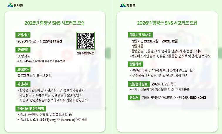 [무한뉴스=최진수 기자] 함양군은 군민의 눈높이에서 소통하며 군의 생생한 현장 소식을 전달할 ‘2026년 함양군 누리소통망(SNS) 서포터즈’를 모집한다고 밝혔다.