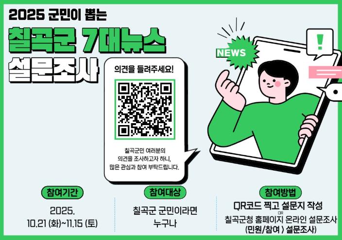 [무한뉴스=최진수 기자] 칠곡군은 올 한 해 군정 주요 이슈 중 군민들의 관심이 컸던 ‘2025년 7대 뉴스’를 선정하기 위한 설문조사를 10월 21일부터 11월 15일까지 실시한다.