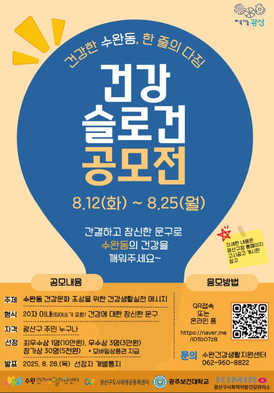 선정된 수상작은 향후 건강생활실천 현수막, 웹자보 등으로 제작해 캠페인 및 홍보에 활용할 예정이며, 공모전에 대한 자세한 사항은 수완건강생활지원센터(062-960-8822)로 문의하면 된다.