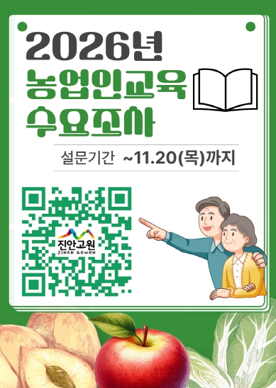[무한뉴스=정민정 기자] 진안군(군수 전춘성)은 2026년도 진안환경농업대학 및 농업인교육 과정 선정을 위해 10월 21일부터 11월 20일까지 한 달간 진안군민과 농업인의 다양한 의견을 반영하기 위한 ‘농업인 교육 수요조사’를 실시한다.
