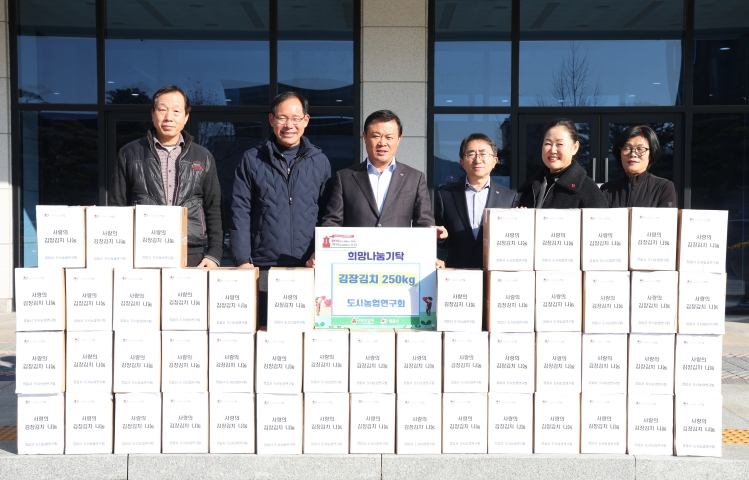 시는 12일 도시농업연구회가 직접 재배한 배추와 무로 담근 김치 5kg 50상자(190만원 상당)를 기탁하며 온정을 나눴다고 밝혔다.