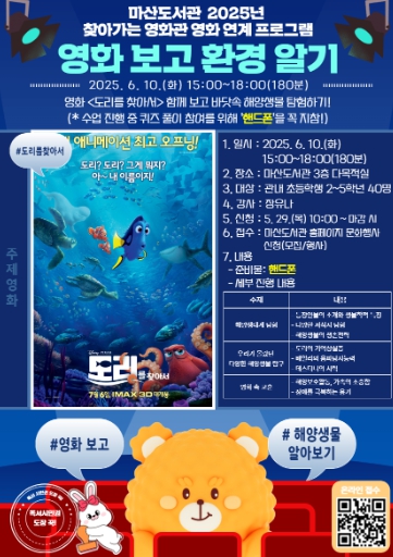 이번 프로그램은 한국영상자료원의 ‘찾아가는 영화관’의 영화 연계 프로그램인 '영화보고 과학탐구'의 일환으로, 김포시 마산도서관이 진행 기관으로 선정됐다. 프로그램은 관내 초등학교 2~5학년 학생 40명을 대상으로 하며, 주제 영화인 '도리를 찾아서'를 함께 관람한 후, 영화 속 해양동물과 해양 생태계에 대해 배우는 시간을 갖는다.