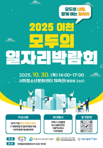 [무한뉴스=정충근 기자] 이천시는 관내 우수기업의 인력난 해소와 시민의 취업 기회 확대를 위해 ‘2025 이천 모두의 일자리박람회’를 오는 10월 30일 오후 2시부터 5시까지 서희청소년문화센터 체육관에서 개최한다고 밝혔다.