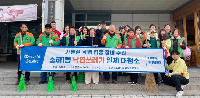 소하1동은 지난 25일 자율방재단 20여 명이 청사 주변 낙엽을 정비하며 활동을 시작했으며, 26일에는 통장협의회와 광명안전단 등 60여 명이 한내천 일대에서 두 번째 정비 활동을 이어갔다.