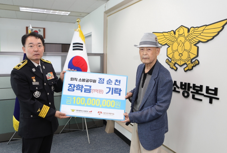 [무한뉴스=정민정 기자] 대전소방본부는 6월 13일, 퇴직 소방공무원 정순천(81세) 씨로부터 장학금 1억 원을 기탁받는 ‘정순천 장학금 기탁식’을 소방본부장실에서 개최했다.