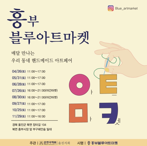 흥부블루아트마켓은 (사)한국예술문화단체총연합회 울진지회 주관으로 20여 팀의 핸드메이드 작가들이 참여하는 핸드메이드 아트페어로 올해 11월까지 매월 운영하며, 4월 26일 오전 11시부터 오후 5시까지 퀼트공예, 목공소품, 레진아트, 가죽공예, 인형공예 등 다양한 작품들을 전시 판매할 계획이다.