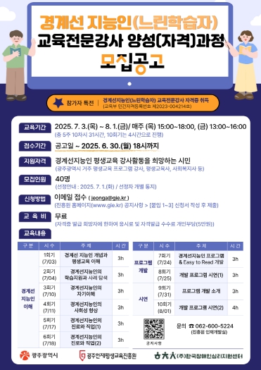 [무한뉴스=정민정 기자] 광주광역시와 (재)광주인재평생교육진흥원(원장 이춘문)이 '2025년 경계선지능인(느린학습자) 교육전문강사 양성(자격)과정' 참여자를 오는 6월 30일까지 모집한다.