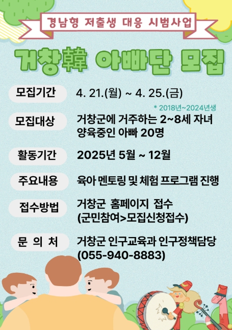 신순화 인구교육과장은 “이번 ‘거창한(韓) 아빠단’ 운영을 통해 육아에 어려움을 느끼는 아빠들이 함께 소통하고 공감하며 육아 부담을 덜 수 있길 바란다”라며 “아빠의 육아 참여가 가족의 행복을 높이고 저출생 위기 극복에도 긍정적인 역할을 하길 기대한다”라고 전했다.